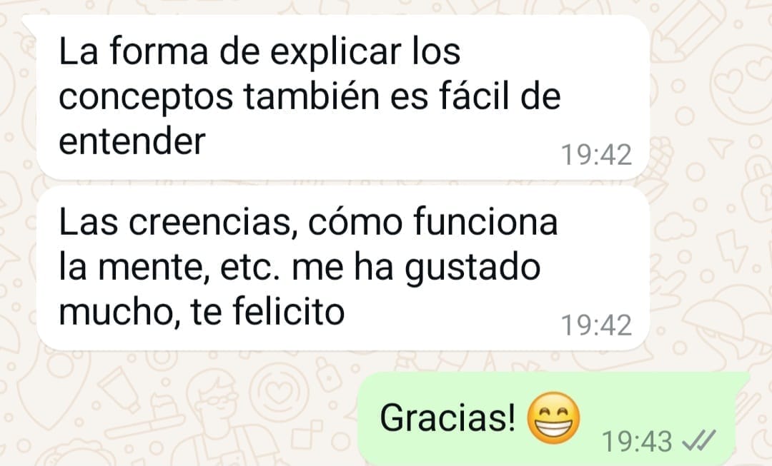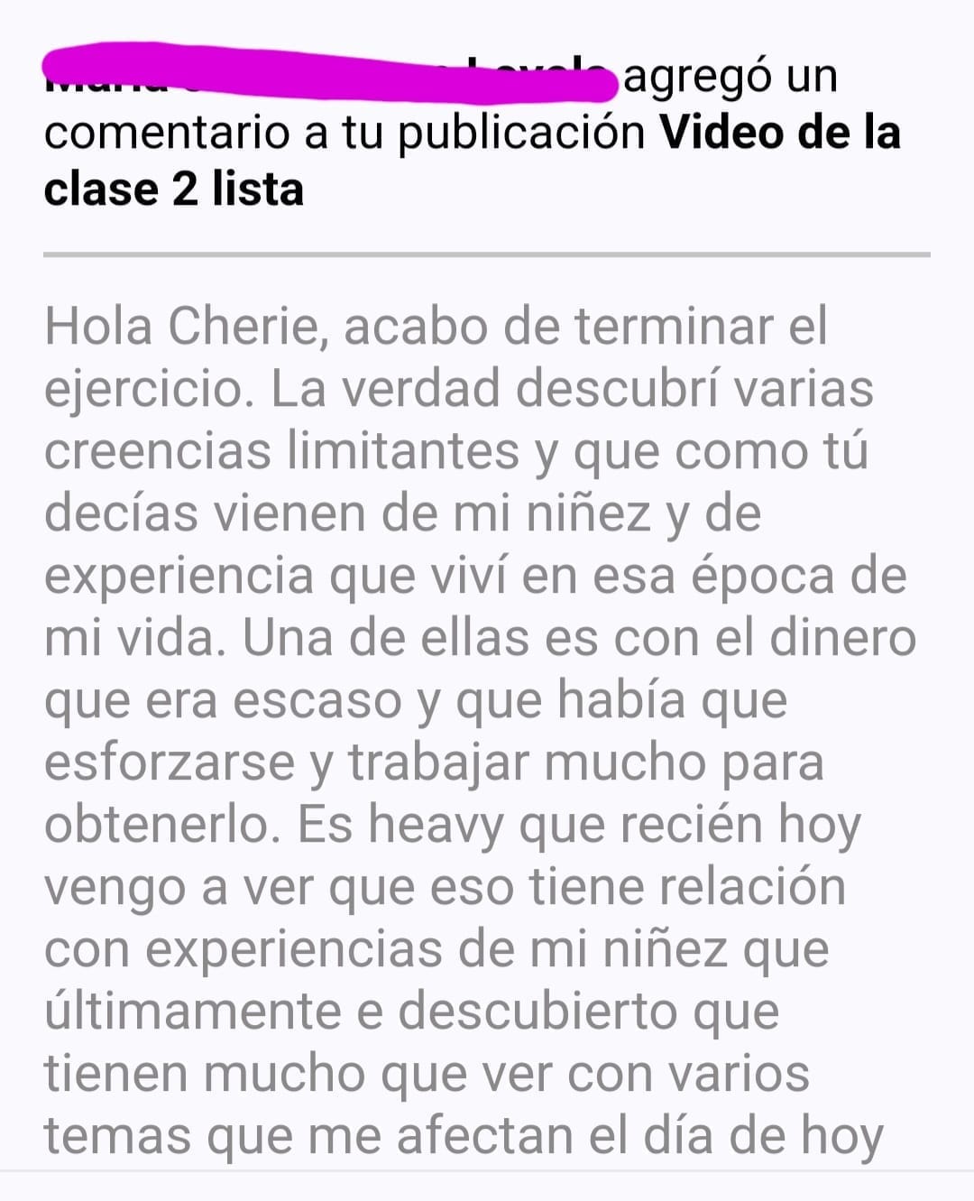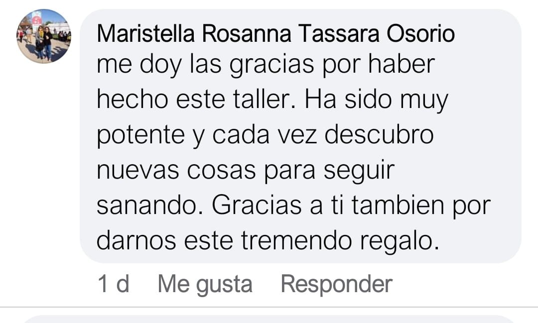 Me conecté conmigo misma en cada palabra, en los ejercicios con la niña interior y con la otra persona. Fue útil este taller para ver mis fantasmas. Los ejercicios fueron fáciles, sobretodo compartir con los demás»